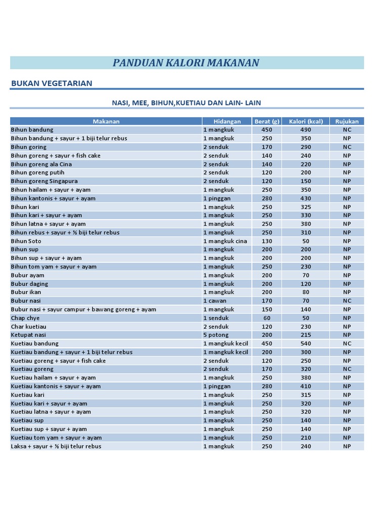Berikut adalah daftar kalori makanan pelbagai jenis masakan popular di Malaysia dengan jumlah kalori masing-masing. Check more flip ebooks related to BUKU PANDUAN DIET of bhavani1281. Cuba anda kira sendiri berapa jumlah kalori makanan yang sedang anda ambil hari.